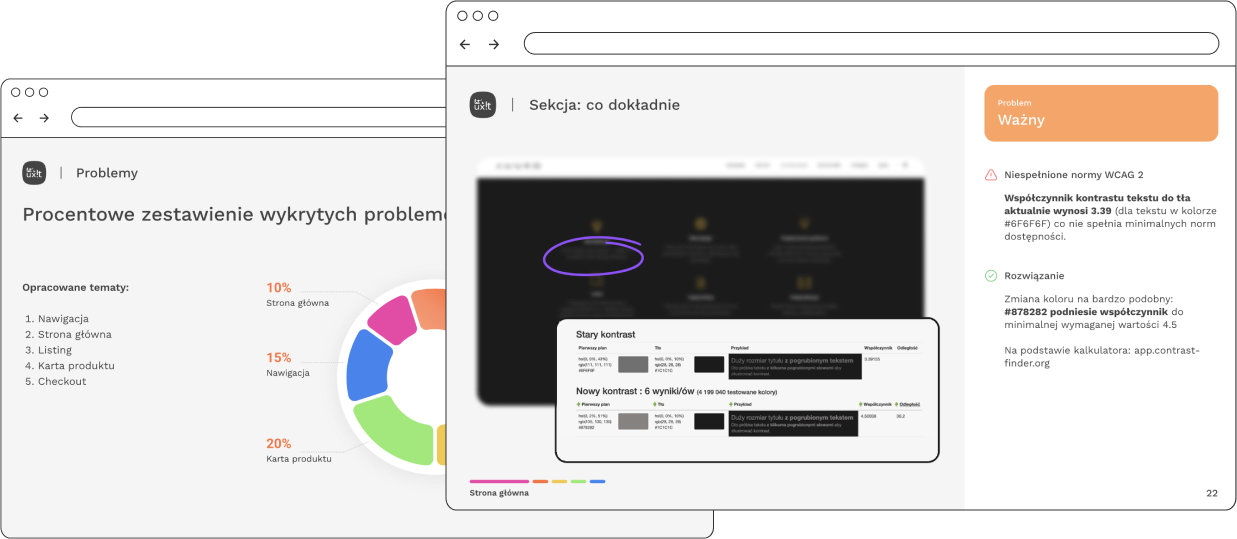 Audyt UX skupia się głównie na identyfikacji błędów w doświadczeniu użytkownika oraz rekomendacjach zmian. Nie obejmuje on bezpośrednio projektowania interfejsu użytkownika. Niemniej jednak, na podstawie wyników audytu, Twój zespół wewnętrznych Web Designerów jest w stanie przygotować projekt UI. Istnieje również możliwość wykupienia usługi projektowania UI w naszej ofercie.