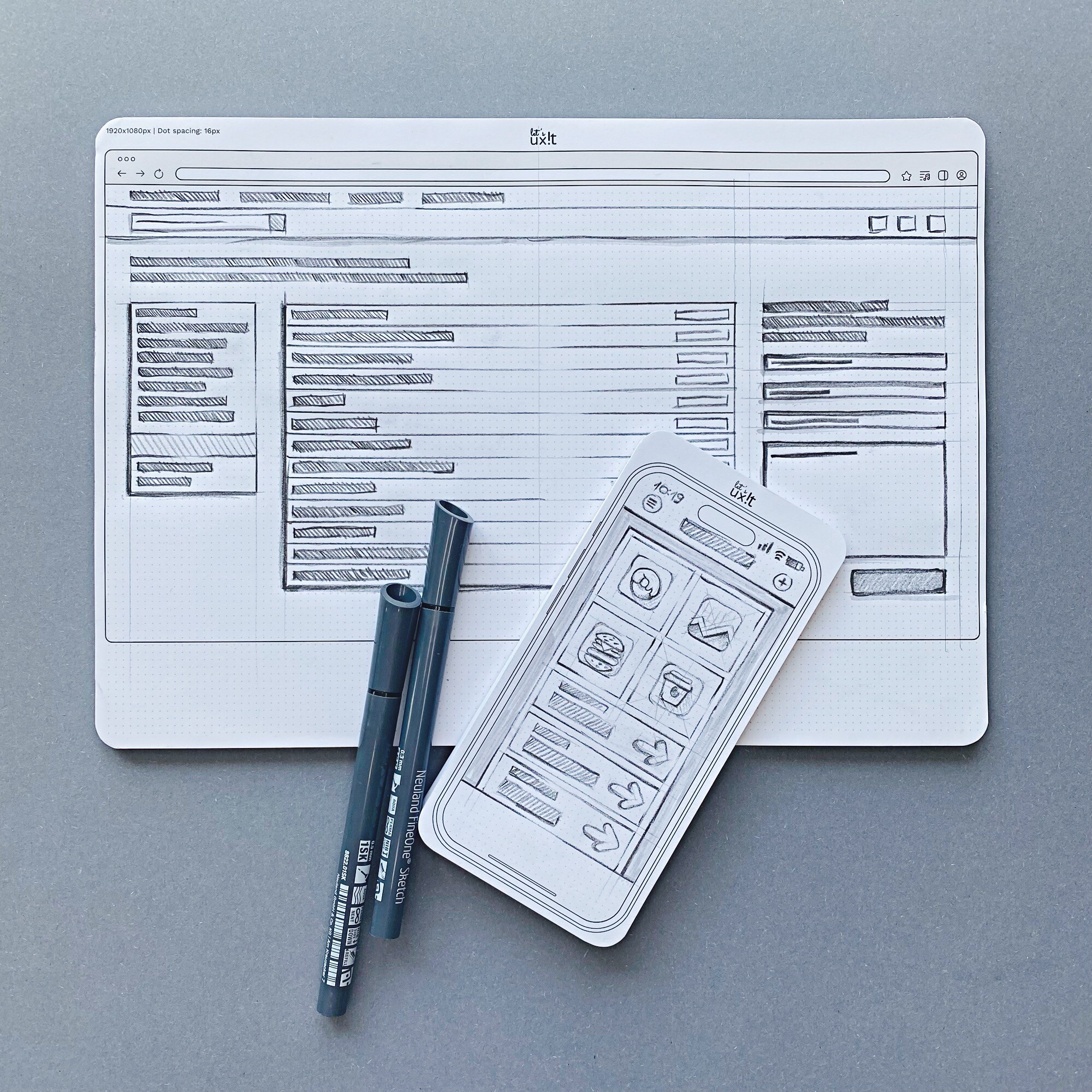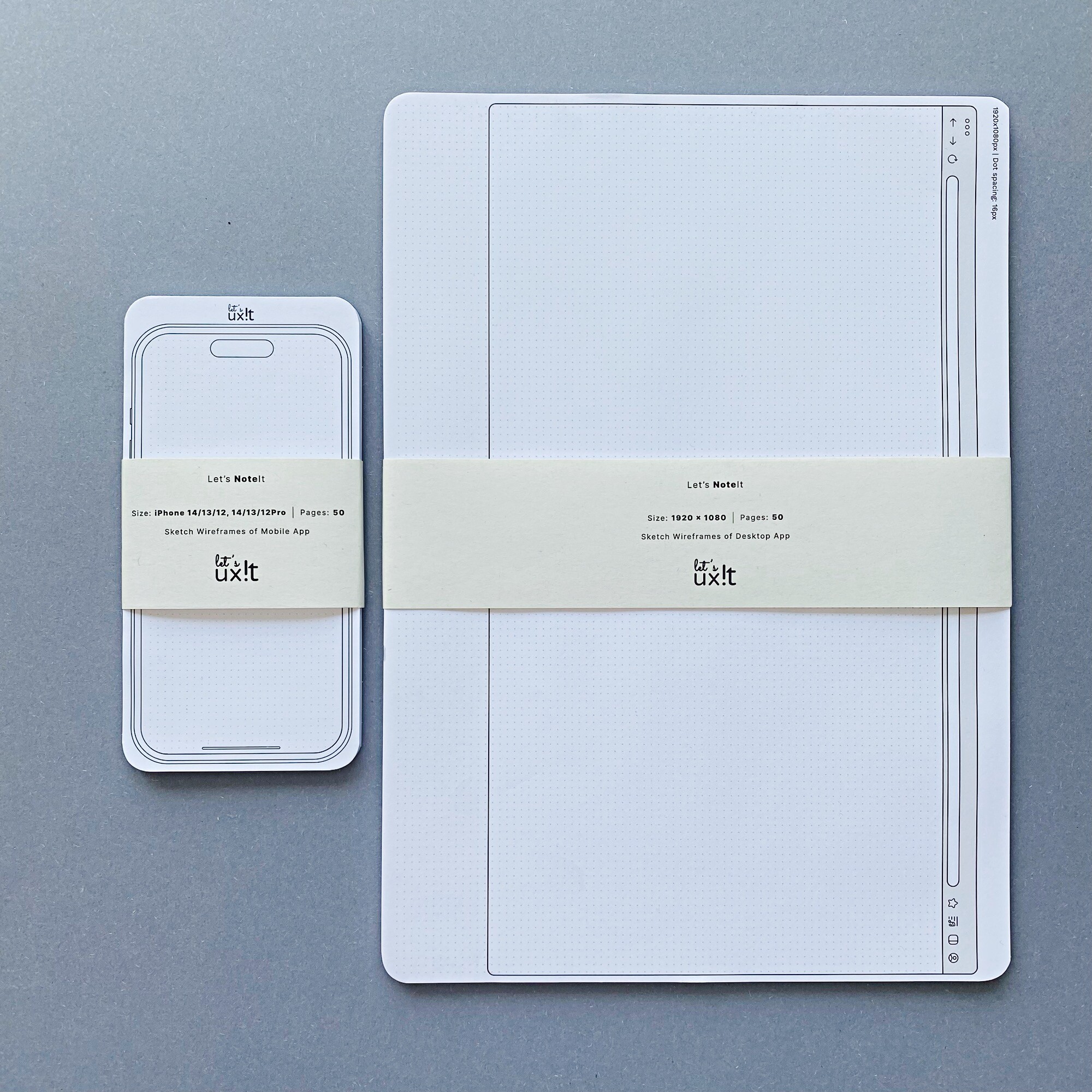 Kompletny zestaw notesów do makietowania, który obejmuje notes w formacie iPhone oraz większy notes desktopowy A4. Idealny dla projektantów UX/UI, grafików i webmasterów, którzy potrzebują narzędzi do tworzenia szybkich szkiców aplikacji mobilnych i komputerowych. Notes mobilny pozwala odwzorować interfejsy na ekranach iPhone'ów, a notes desktopowy umożliwia projektowanie na widoku przeglądarki 1920x1080 px. Każdy z notesów zawiera 50 stron, a praktyczne klejenie po boku ułatwia rysowanie i zestawianie ekranów w spójny user flow.